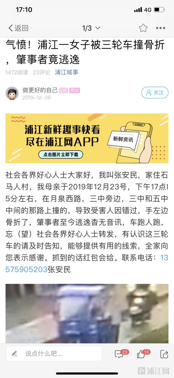 12月26日网友爆料:气愤!浦江一女子被三轮车撞骨折,肇事者竟逃逸(点击查看)