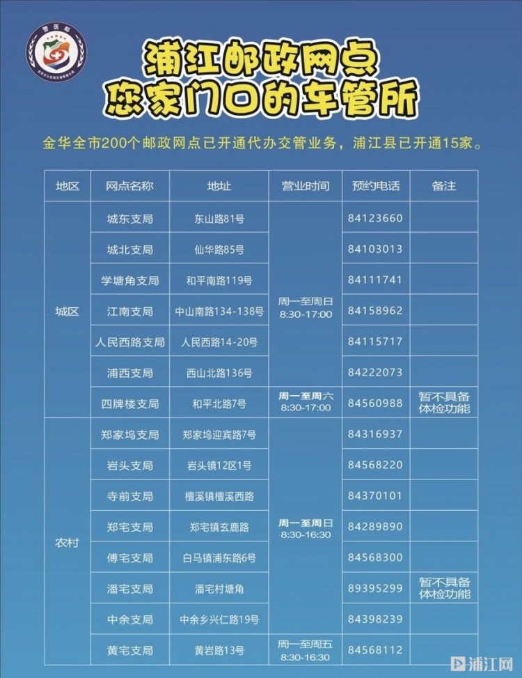 注:以上业务只能到交警大队处罚中心窗口办理(浦江县恒昌大道999号)