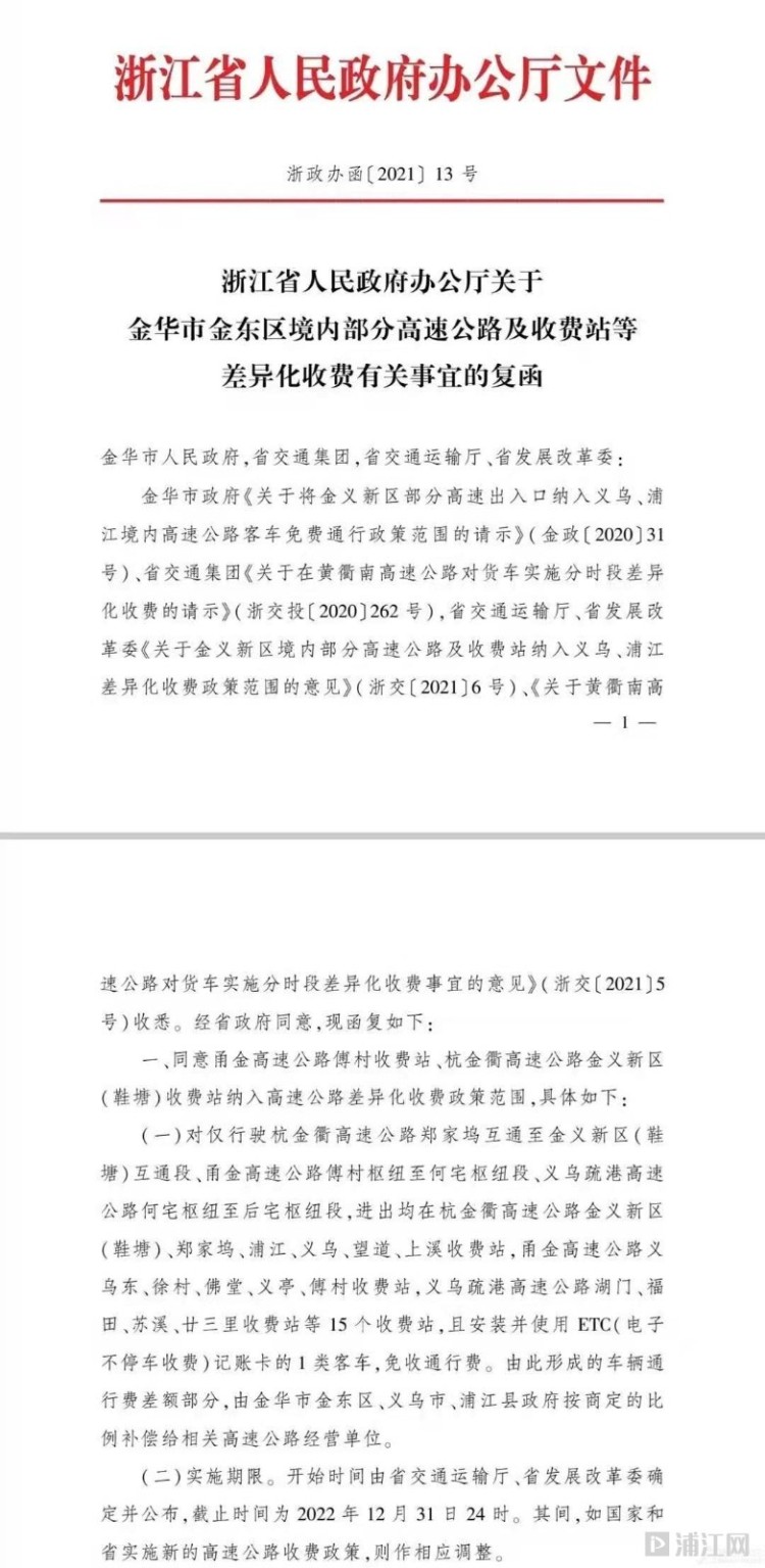 2019年3月,为加快义浦交通互联互通,推动交通产业融合发展,加快释放义乌国际贸易综合改革试验区的改革红利,根据《义乌浦江战略合作意见书》结合两地交通实际,特制定深化义乌浦江交通战略合作意见书,提出尽快将浦江纳入义乌境内高速客车免费通行政策范围。2019年12月1日起,浦江县正式纳入义乌市境内高速客车免费通行政策范围。范围是义乌市和浦江县行政辖区范围互通之间出入给予免通行费优惠,涉及义乌境内11个收费站(包括义乌、望道、上溪、义亭、佛堂、徐村、义乌东、廿三里、苏溪、福田、湖门收费站),浦江县境内2个收费站(包括郑家坞、浦江)。近日,一则甬金高速傅村收费站、杭金衢高速金义新区(鞋塘)收费站纳入义乌高速“免费圈”的消息在网上传开,从义乌相关部门核实到,情况属实!这也意味着浦义高速公路免费通行范围将扩大!实施时间敬请期待!