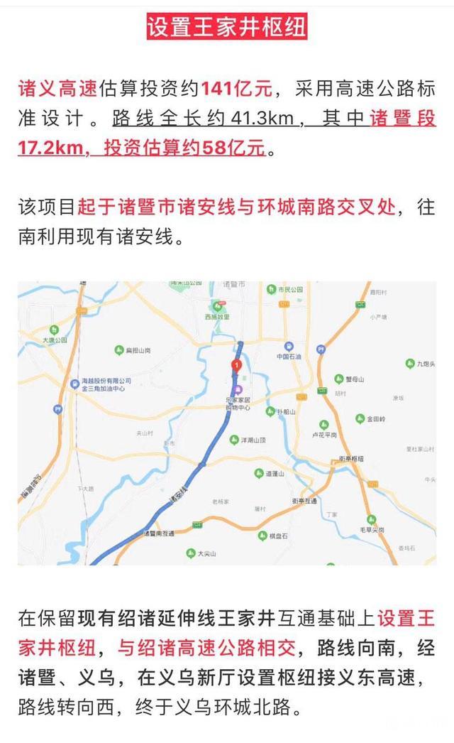在保留现有绍诸延伸线王家井互通基础上设置王家井枢纽,与绍诸高速公路相交,路线向南,经诸暨、义乌,在义乌新厅设置枢纽接义东高速,路线转向西,终于义乌环城北路。