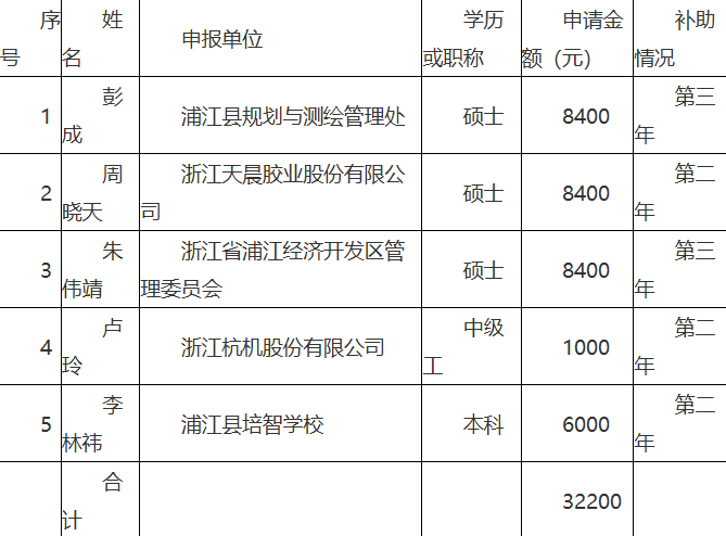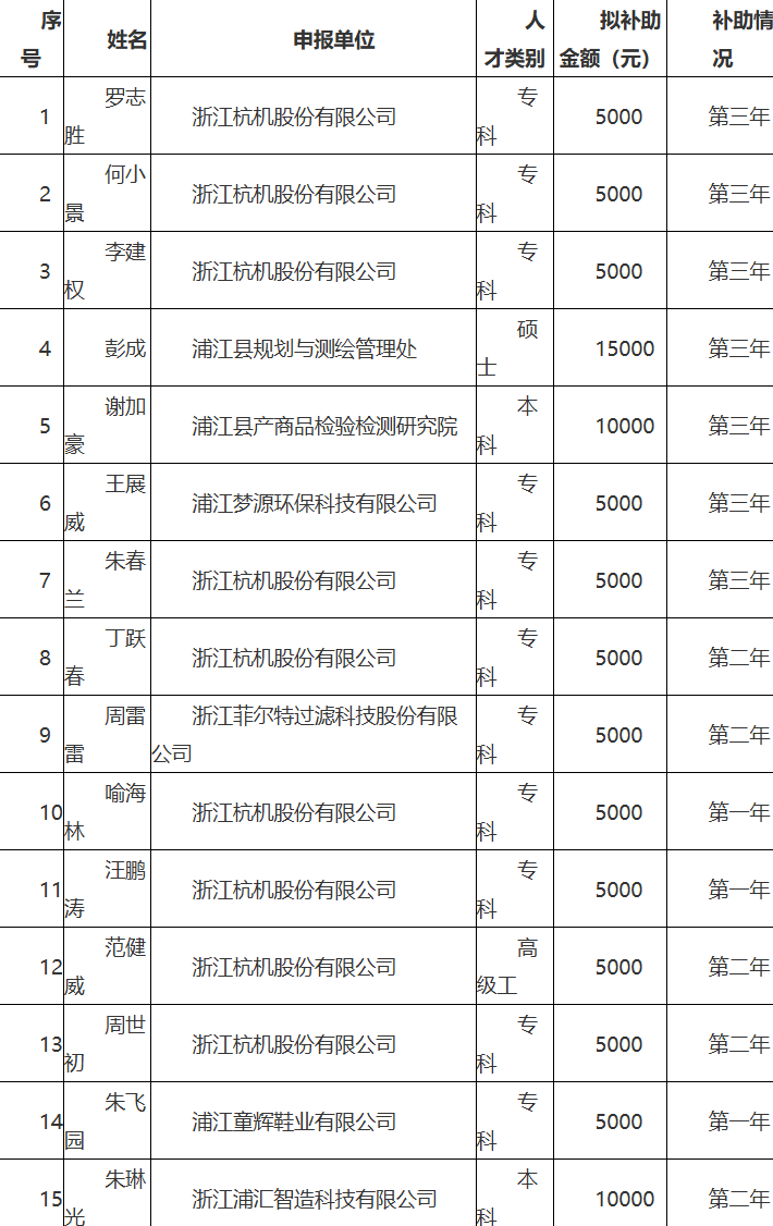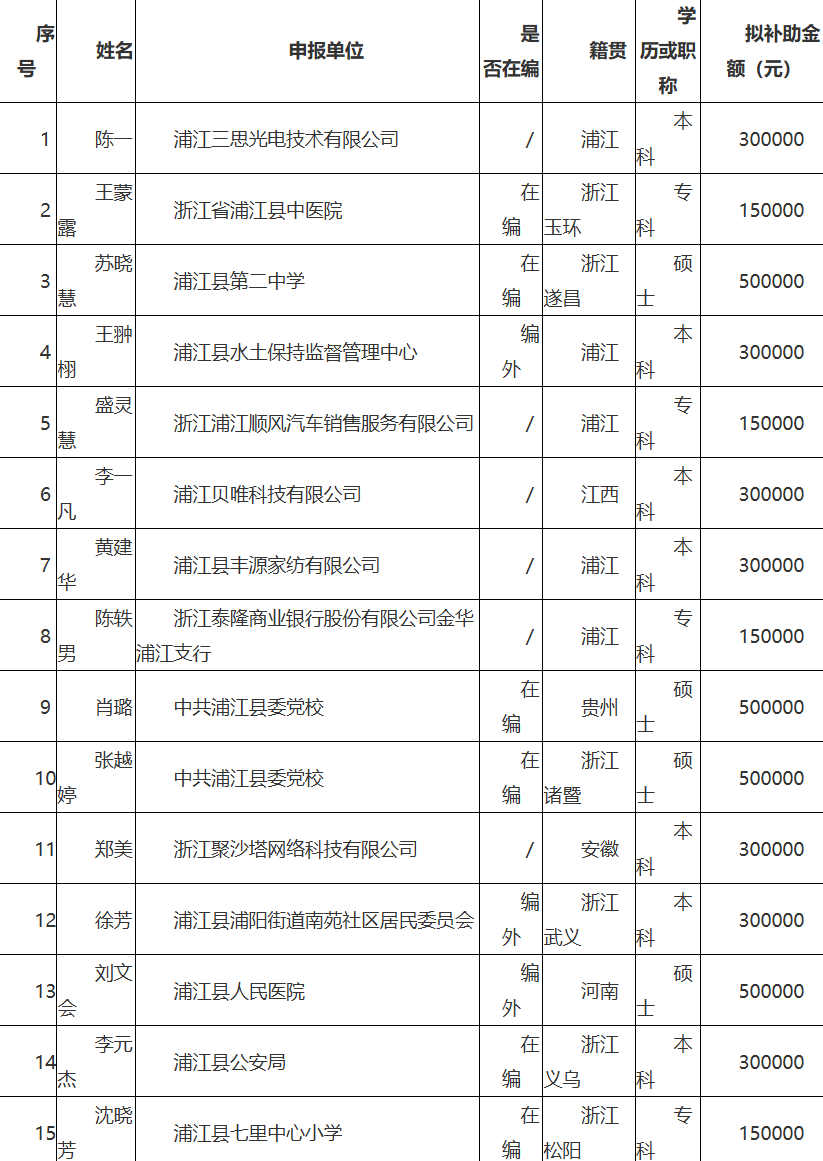 为进一步贯彻落实县委"五大战略",大力开展人才科技攻坚行动,全方位培育、引进、用好人才,根据《关于支持人才创业创新促进“繁荣浦江”建设的若干意见》(浦委发〔2017〕37号)、《关于实施“才聚浦江”行动打造创业创新高地的意见》(浦人才〔2022〕1号)文件精神,经自主申报、科室审核、部门联审,现将拟享受人才政策补助的人员予以公示(名单附后)。公示期从2026年1月28日起到2月3日止。单位和个人对公示对象享受人才政策补助方面存在的问题,均可以通过来信、来电、来访等形式反映。单位反映问题的,须盖公章;个人反映问题的,提倡署本人真实姓名。反映问题要坚持实事求是的原则。