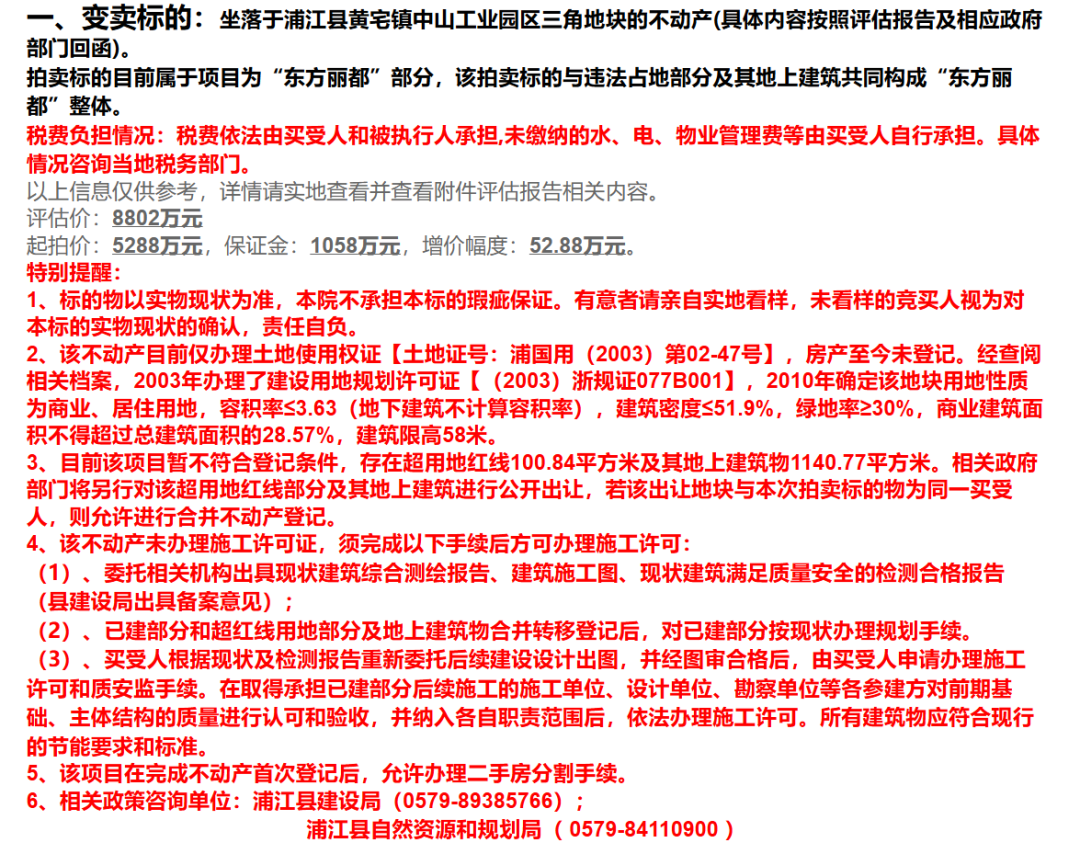 近期,阿里拍卖网显示,浦江县黄宅镇中山工业园区三角地块不动产“东方丽都”迎来第六次拍卖,最终仍因无人出价再度流拍。