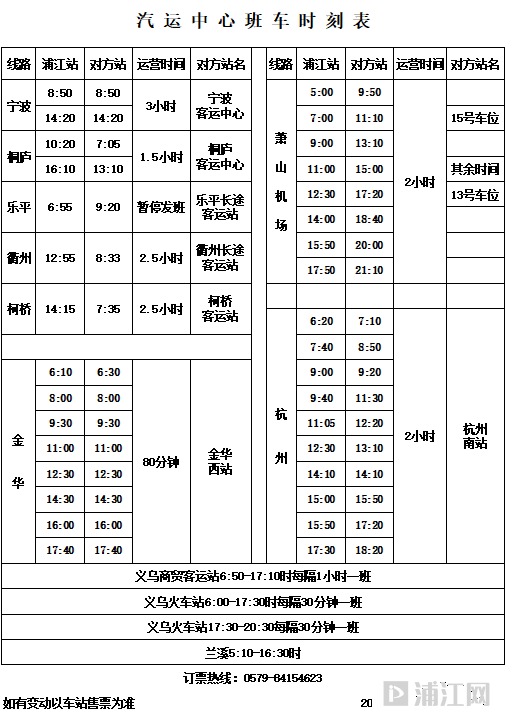 浦江汽运中心—中山南路—江滨东路—恒昌大道—210省道—城北路—稠州北路—诚信大道—国际商贸城客运中心(公交停车场)