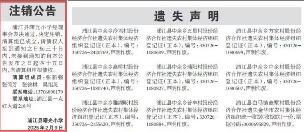 2026年2月9日,《浦江今日报》刊登关于“浦江县曙光小学注销公告”,